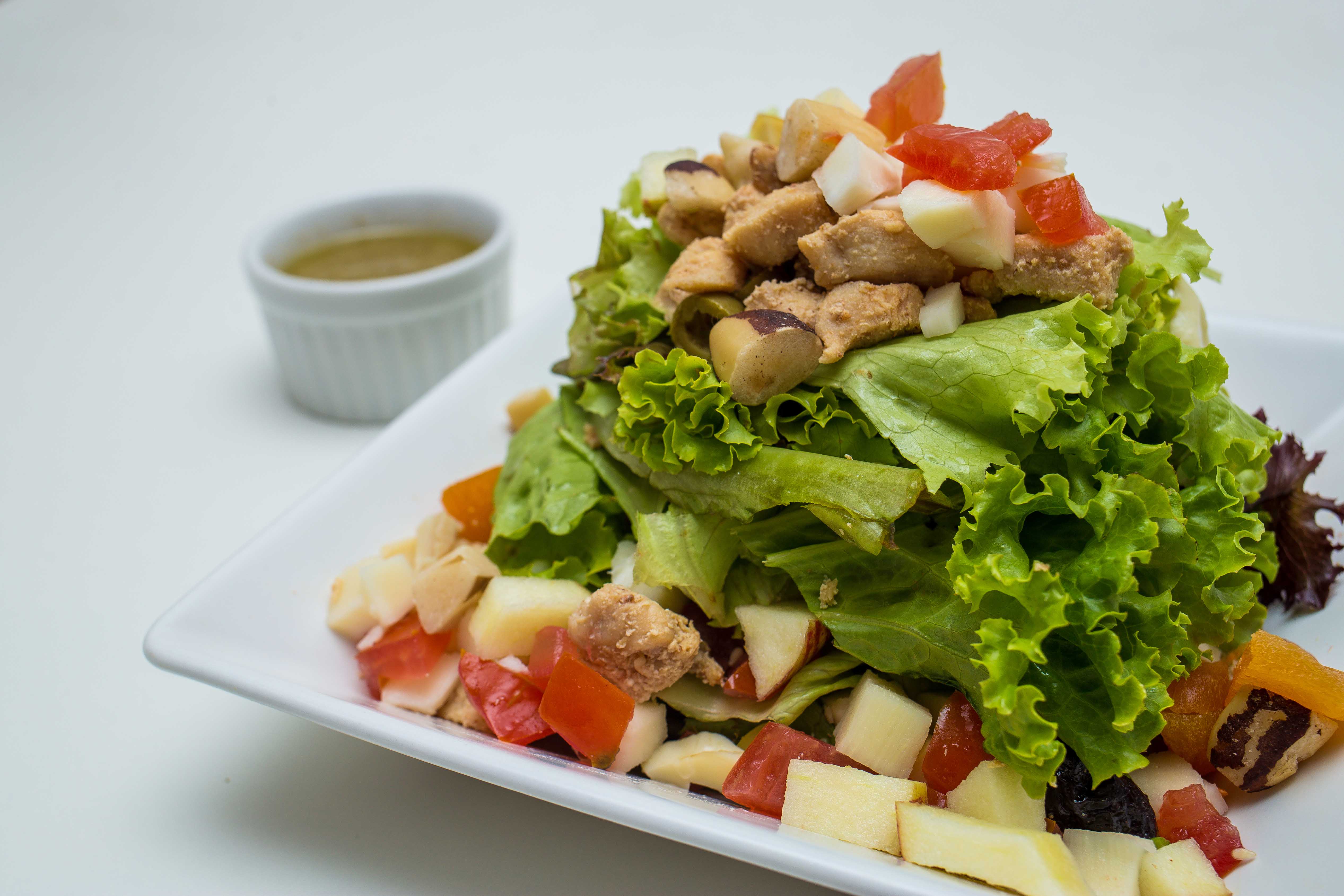 Mix de alface, rúcula, tomate italiano, cenoura, palmito, damasco seco, frango, amendoim e molho de limão