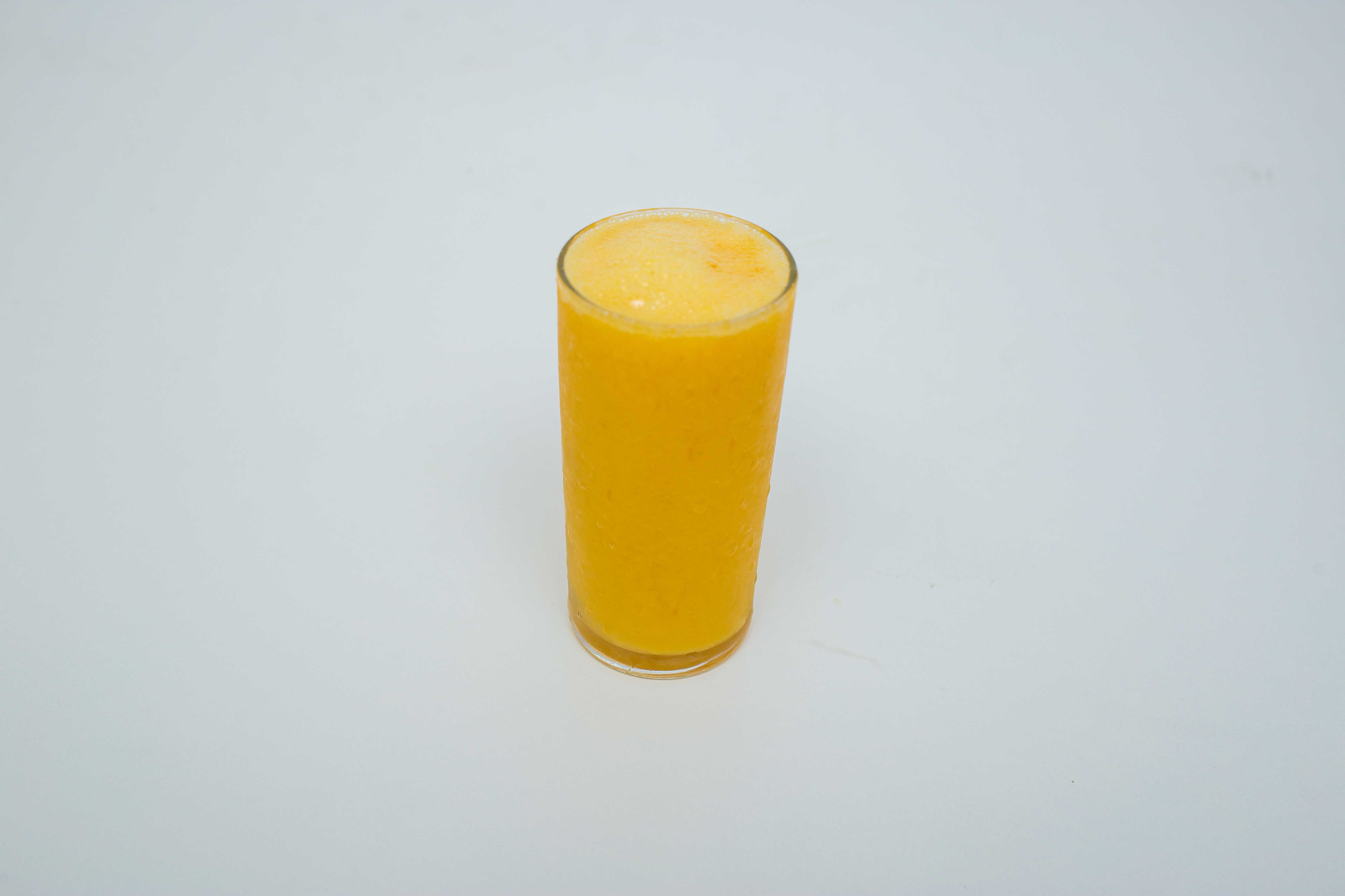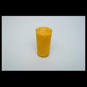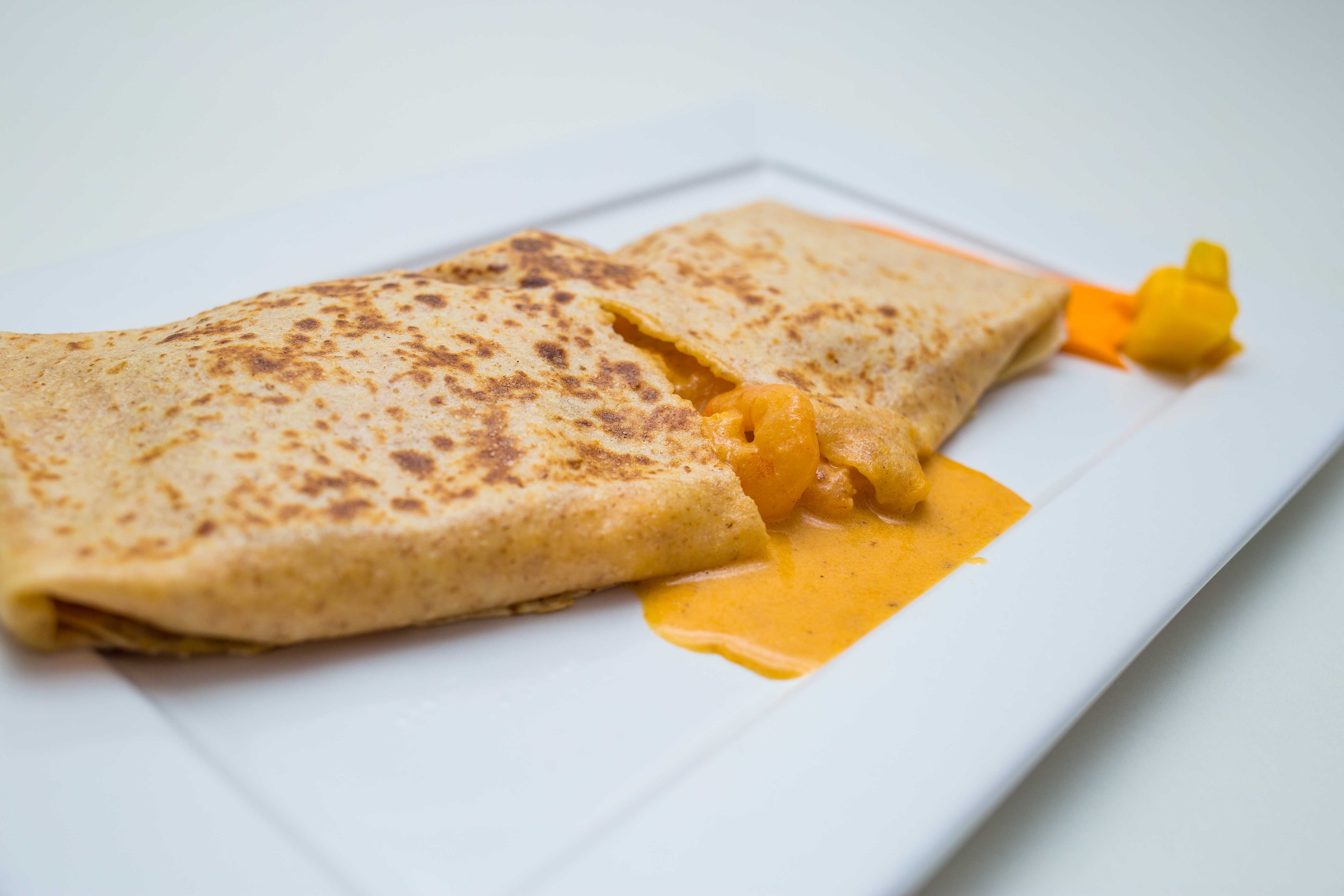 Camarão salteado, acompanhado de manga e molho à base de queijo chedar