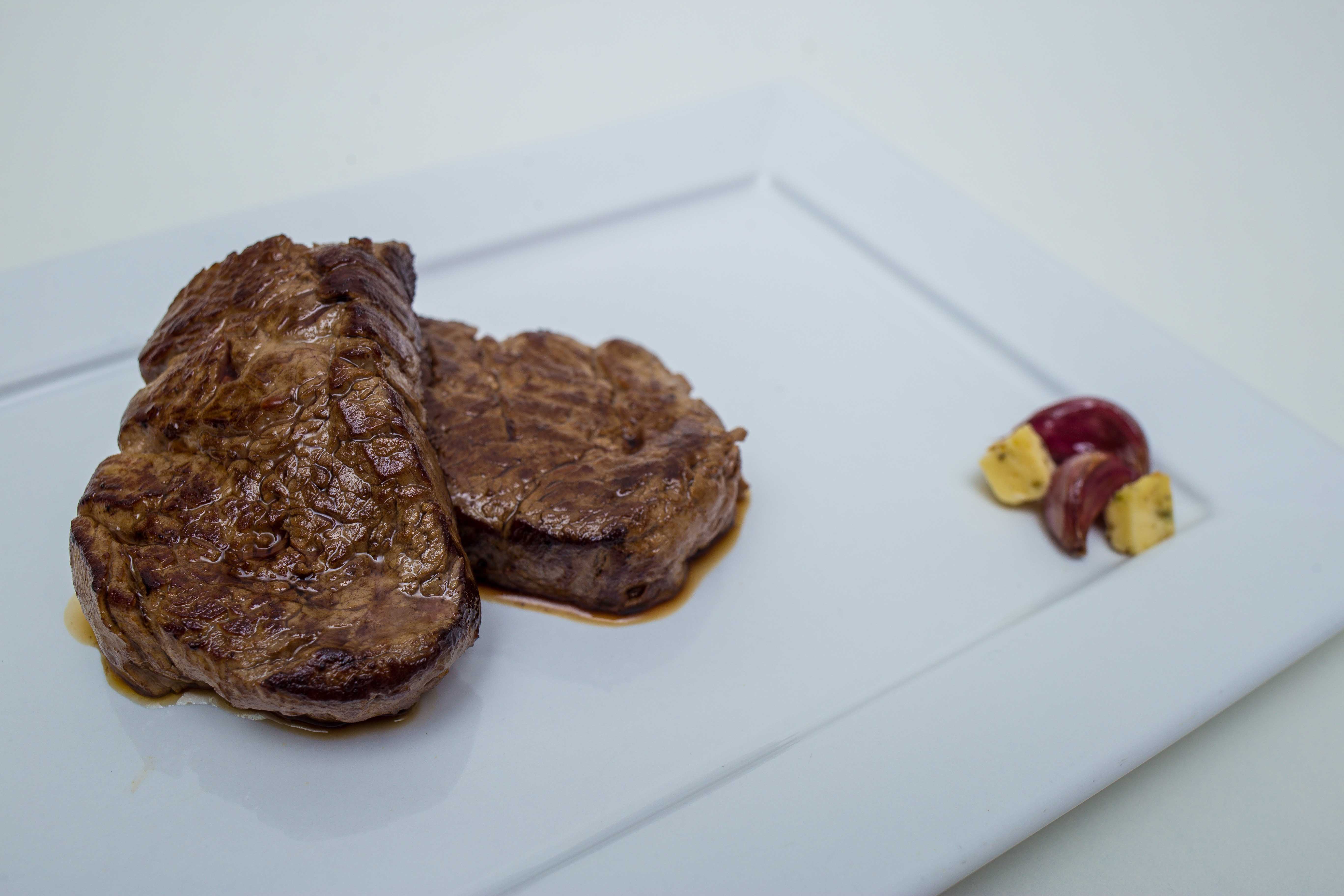 Filé mignon salteado, acompanhado de cebola caramelizada e palmito